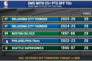 96-97賽季以來單賽季利用對(duì)手失誤得到25+紀(jì)錄: