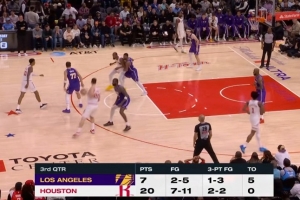 第三節前半節,火箭轟出20-7的攻擊波,火箭投籃11中7(三分2中2),湖人則5中2(3中1)。湖人5失誤,火箭0次。