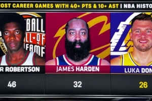 據統計,這是東契奇生涯第26場單場至少40分10助攻,歷史第三多,僅次于大O和哈登。