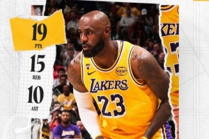 賽后湖人官方發(fā)布詹姆斯本場(chǎng)數(shù)據(jù)海報(bào),本場(chǎng)比賽詹姆斯背靠背出戰(zhàn)并砍下三雙。