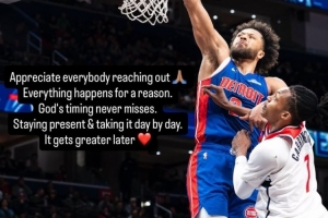 今天,坎寧安曬照并寫道:“感激每個聯系我的人。凡事皆有其因由。上帝的安排總是恰到好處。保持當下,一天一天堅持。我歸來之時會更出色。”