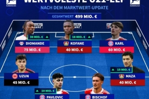 體育資訊3月21日訊 德古轉會市場列出德甲U21球員身價最高陣容,帕夫洛維奇、卡爾、揚·迪奧曼德、武什科維奇在列。
