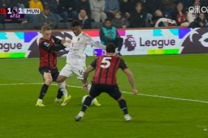 英超第31輪,曼聯客戰伯恩茅斯。67分鐘,阿瑪德禁區內倒地,裁判沒有表示。伯恩茅斯隨后發動反擊扳平比分。