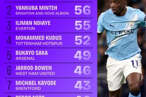 3、恩迪亞耶(埃弗頓):55次