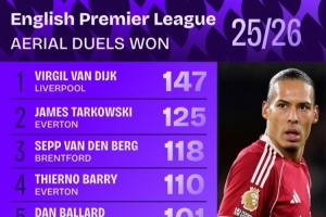 體育資訊3月24日訊 Squawka統計了本賽季球員在英超的爭頂成功次數,并列出榜單,范戴克147次居首,并且他的成功率為75.77%,爭頂100+球員中最高。