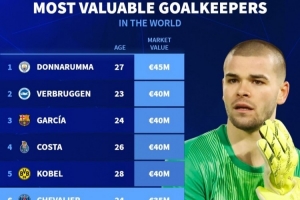 體育資訊3月25日訊 德國轉(zhuǎn)會市場統(tǒng)計了門將的最新身價,并列出榜單,多納魯馬4500萬歐居首,維爾布魯根、霍安·加西亞、迪奧戈·科斯塔、科貝爾4000萬歐。