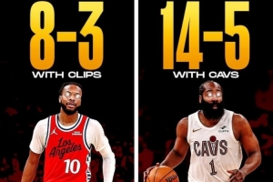 哈登出戰(zhàn)時,騎士隊14勝5負。