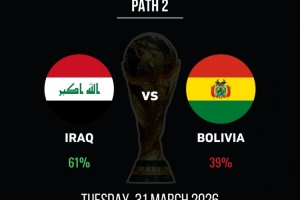 體育資訊3月29日訊 世預(yù)賽洲際附加賽,伊拉克將和玻利維亞爭(zhēng)奪一個(gè)世界杯參賽名額。本場(chǎng)比賽之前,伊拉克被認(rèn)為有著61%的晉級(jí)概率。