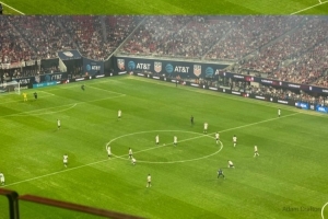 美國隊在梅賽德斯-奔馳體育場進行本場比賽時,身著為今年夏天世界杯發布的新款球衣。這款球衣采用了美國國旗的色調,球衣上印有波浪狀的紅色和白色條紋,球衣背面則有大面積的白色區域。