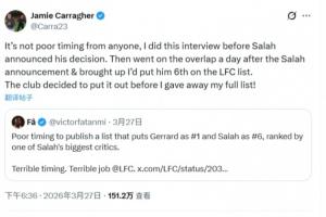 卡拉格回復這名球迷:“這絕非任何人的時機考量失當——我早在薩拉赫宣布決定前就完成了這次采訪。薩拉赫官宣的次日,我才在Overlap節目里展開后續話題,提到自己將他排在利物浦隊史榜單的第六位??删銟凡吭谖夜纪暾駟沃?,就把這段內容發布了出去!”