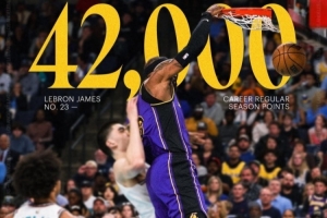 此役,湖人球星詹姆斯通過扣籃拿下生涯常規賽第42000分!