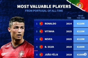 體育資訊3月31日訊 德轉列葡萄牙球員歷史身價榜,C羅2014年1.2億歐身價最高,維蒂尼亞、若昂·內維斯1.1億歐并列第二。