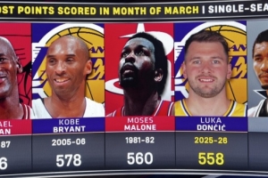 今年三月東契奇總得分558分歷史上三月份第3,喬丹科比前2,摩西·馬龍第3,喬治·格文第5
