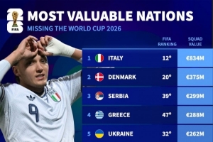 體育資訊4月2日訊 德國轉會市場列出了無緣世界杯球隊身價排名,意大利8.34億歐居首,丹麥、塞爾維亞二三位。