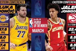 體育資訊4月3日訊 今日NBA官方宣布,湖人球星東契奇和老鷹球星杰倫·約翰遜分別當(dāng)選三月份西部和東部聯(lián)盟月度最佳球員。