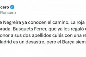 《阿斯報》主編、皇馬球迷龍賽羅社媒寫道:“內(nèi)格雷拉的繼承者們已經(jīng)摸清了門道。這是本賽季至今最明顯的紅牌。布斯克茨·費雷爾——這位已經(jīng)在巴列卡斯送給過他們一個點球的裁判——用一次可恥的改判,完美地印證了他的兩個帶有巴薩色彩的姓氏,皇馬表現(xiàn)確實糟糕,但巴薩永遠(yuǎn)是12人作戰(zhàn)。”