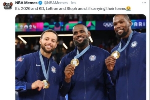 美媒NBA Memes曬出詹杜庫在巴黎奧運會的合照,配文寫道:“如今已是2026年,KD、詹姆斯和庫里依然在獨自扛著各自的球隊前行。”