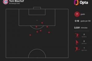 據Opta統計,比朔夫上賽季以來在德甲打進7球,其中6球是禁區外破門,同期德甲禁區外進球數量僅少于凱恩(7球)。