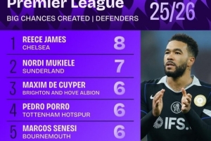 體育資訊4月6日訊 squawka統計了本賽季英超后衛的創造重大機會情況,藍軍隊長里斯·詹姆斯領跑。