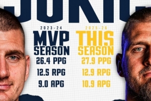 約基奇本賽季場均27.9分12.9籃板10.9助攻,上個MVP賽季(23-24賽季)場均26.4分12.5籃板9助攻。