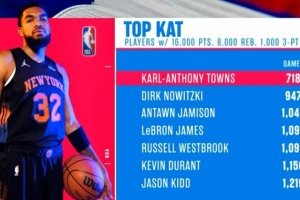 在今天的戰勝老鷹的比賽中,尼克斯中鋒唐斯達成生涯16000分8000籃板1000三分的成就,是歷史第七個達成這一成就的球員。