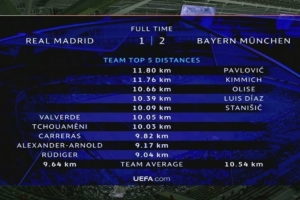 體育資訊4月8日訊 在歐冠淘汰賽首回合,拜仁2-1擊敗皇馬。以下為雙方球員本場比賽跑動數據前列的球員。