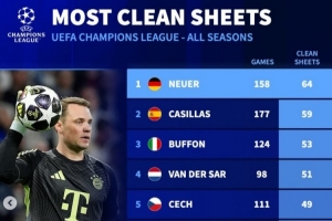 體育資訊4月8日訊 拜仁在本輪歐冠焦點戰客場2-1力克皇馬,40歲諾伊爾表現搶眼,完成多次精彩撲救。數據統計顯示,他仍是歐冠零封次數最多的門將。
