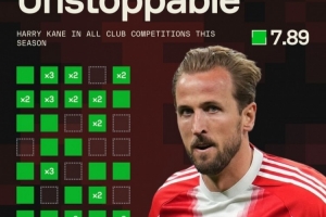 據Sofascore統計,凱恩本賽季為拜仁出戰41場比賽,打進49球,僅10場比賽未破門,從未連續3場比賽無進球。