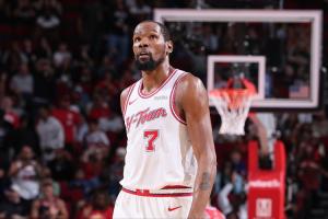 前三節結束時,火箭還以96-73領先76人23分。當時杜蘭特被換下場休息,有望三節打卡。結果末節火箭場上球員表現太抽象,被76人轟出一波進攻高潮追到11分,直接把杜蘭特打了回來。76人攻擊波還在繼續,把分差縮小到7分,杜蘭特命中三分+助攻阿隆·霍勒迪投進三分,為火箭穩住局面。