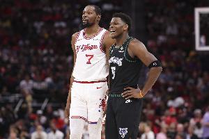賽后,愛德華茲和杜蘭特擁抱致意,當被問及兩人對話內容時,愛德華茲笑著說道:“我在跟他要球衣,我已經有一些了,但還想要一件。”