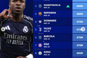 體育資訊4月13日訊 德轉更新了足壇左邊鋒身價情況,維尼修斯以1.5億歐居首,K77以9000萬歐位居次席。