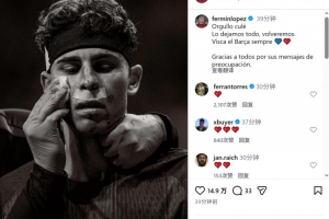 此役巴薩中場費爾明被馬競門將穆索踢到臉部,費爾明社媒曬出臉部受傷的照片,并寫道:“巴薩人的榮耀!我們已傾盡全力,我們會再回來的。巴薩萬歲,永遠!感謝大家的關心留言?!?/p>