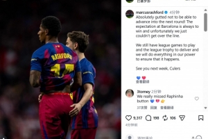 體育資訊4月15日訊 在歐冠1/4決賽,巴薩總比分2-3被馬競淘汰,拉什福德也在個人社媒發(fā)文談到自己的感受。
