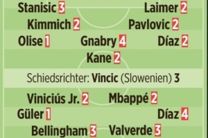 皇馬首發:盧寧4分、門迪2分、呂迪格4分、米利唐5分、阿諾德3分、貝林厄姆3分、巴爾韋德3分、居萊爾1分、布拉欣·迪亞斯4分、維尼修斯2分、姆巴佩2分