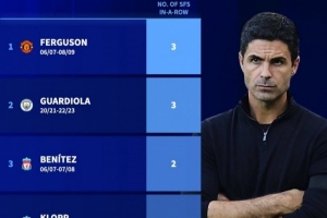 統(tǒng)計(jì)表明,阿爾特塔成為歷史上第五位連續(xù)帶隊(duì)進(jìn)入歐冠四強(qiáng)的英超主教練,在他之前,只有弗格森(2006-07賽季至2008-09賽季連續(xù)3次)、瓜迪奧拉(2020-21賽季至2022-23賽季連續(xù)3次)、貝尼特斯(2006-07賽季至2007-08賽季連續(xù)2次)和克洛普(2017-18賽季至2018-19賽季連續(xù)2次)做到過(guò)。