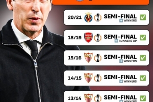 執(zhí)教以來,維拉主帥埃梅里已經(jīng)7次闖進(jìn)歐聯(lián)杯半決賽,他本賽季有望奪得第5個(gè)歐聯(lián)杯冠軍。除了率領(lǐng)維拉闖進(jìn)歐聯(lián)杯半決賽外,埃梅里還曾率領(lǐng)瓦倫西亞、塞維利亞(3次)、阿森納以及比利亞雷亞爾闖進(jìn)歐聯(lián)杯半決賽。