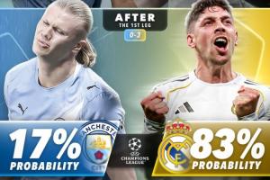 在首回合比賽前,曼城的晉級概率高達72%,皇馬僅28%,而在首回合0-3失利后,曼城的晉級概率僅剩17%,皇馬晉級概率則飆升至83%。