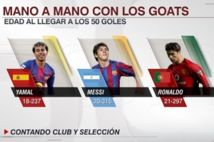 據統計,18歲237天的亞馬爾生涯各項賽事已經打進50粒進球(俱樂部+國家隊),梅西打進生涯50球時為20歲315天,C羅則是21歲297天。
