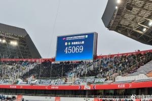 體育資訊03月14日訊 中超第2輪,山東泰山主場(chǎng)對(duì)陣北京國(guó)安的比賽正在進(jìn)行。現(xiàn)場(chǎng)大屏幕顯示,本場(chǎng)比賽的到場(chǎng)人數(shù)為45069人。