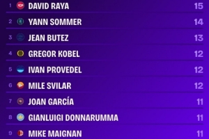 排在他身后的是國米門將索默,有14場零封。巴薩門將霍安·加西亞、曼城門將多納魯馬、米蘭門將邁尼昂和皇馬門將庫爾圖瓦都是11場零封。