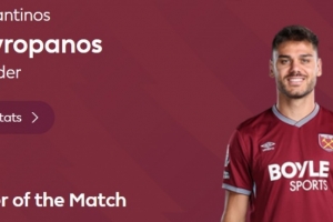 本場比賽西漢姆球員馬夫羅帕諾斯打進一球,賽后當選英超官方球迷票選全場最佳球員。