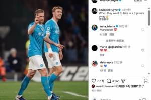 本場比賽德布勞內替補登場,賽后他也在社媒曬出與進球功臣霍伊倫合照,配文寫道:“當對手想從客場拿走我們三分的時候??”