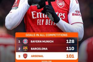 據LiveScore統(tǒng)計,阿森納成為本賽季歐洲五大聯(lián)賽第三支達成百球里程碑的球隊,僅次于拜仁和巴薩。