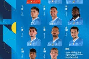 那不勒斯首發:1-梅雷特;31-別克馬、4-布翁喬爾諾、17-奧利維拉;21-波利塔諾、99-安古伊薩、6-吉爾莫、37-斯皮納佐拉、20-埃爾馬斯;27-阿利松·桑托斯、19-霍伊倫